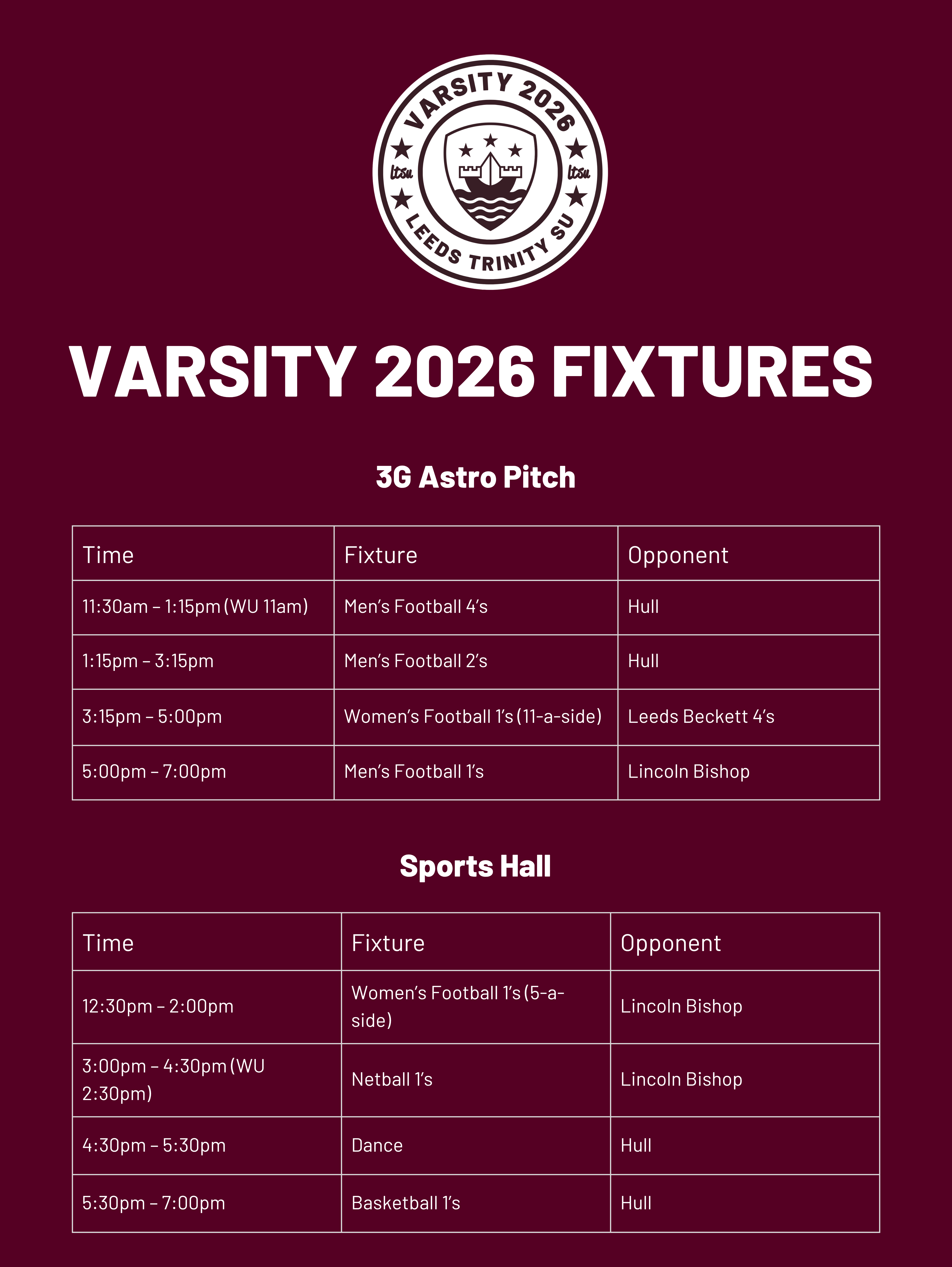 Varsity 2026 is an annual sporting competition, traditionally between two Universities. This year we are having a tripartite tournament between Leeds Trinity, Lincoln Bishop and Hull.